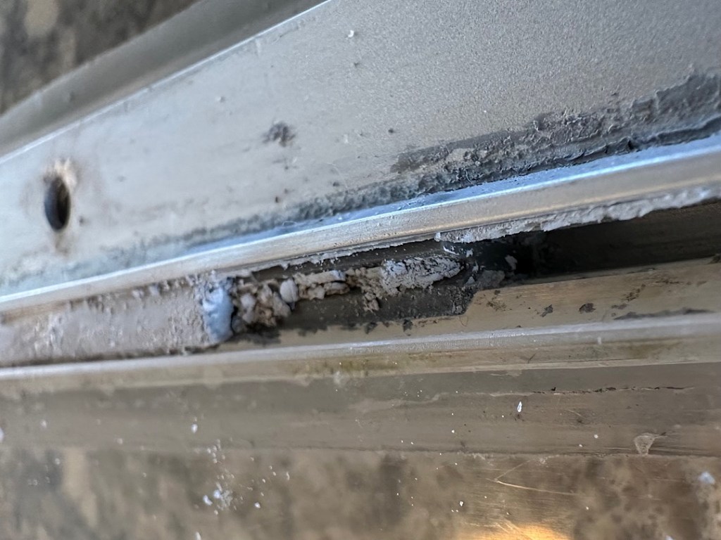 Als wir das Fenster ausbauen, bröselt uns ein Teil der Fugenmasse entgegen.