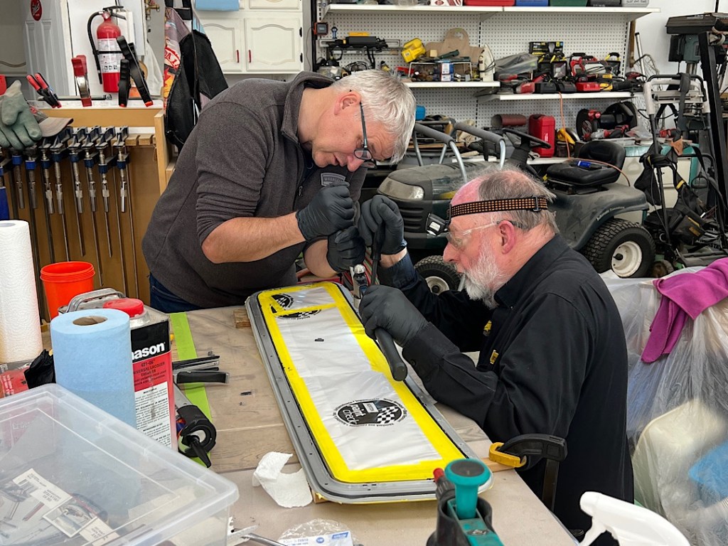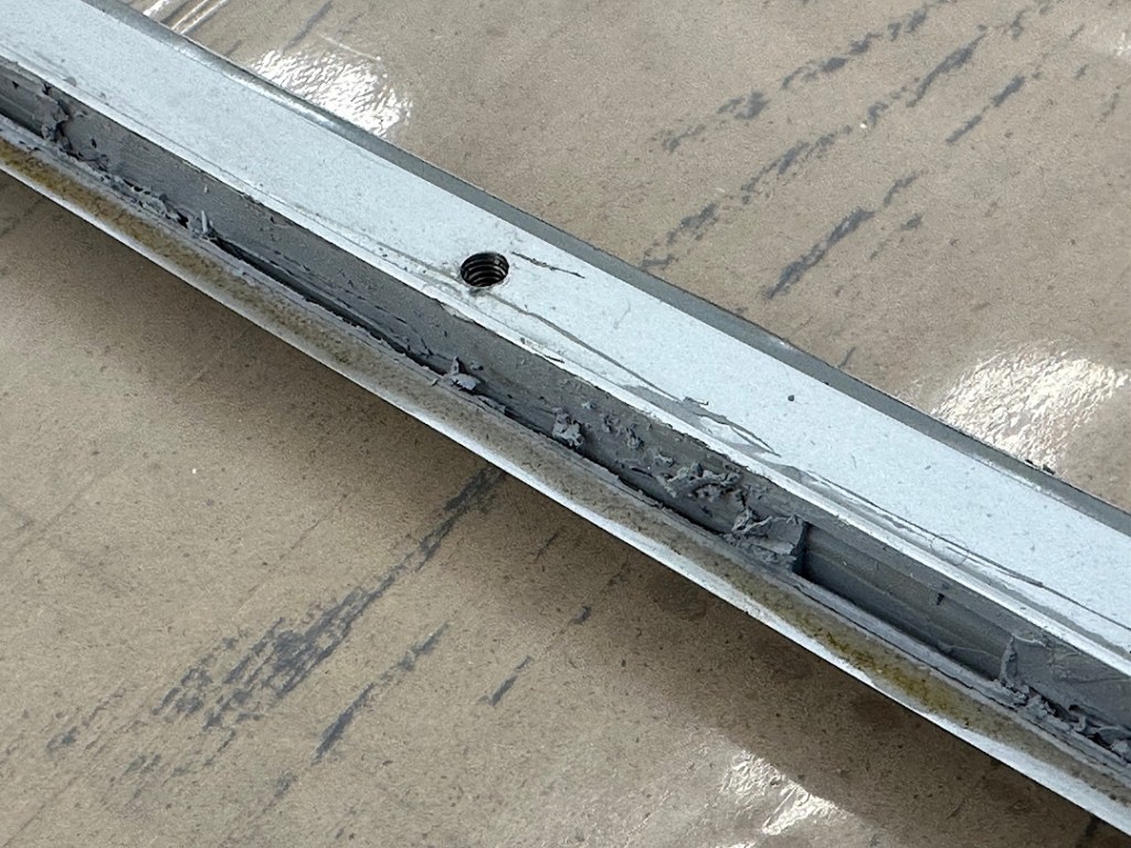 Danach die sauber abgetapete Scheibe mit Sika 295 und den Keilen wieder einkleben, trocknen lassen, Rahmen einsetzen, festschrauben (mit TefGel, Edelstahlschrauben in Aluminium) …