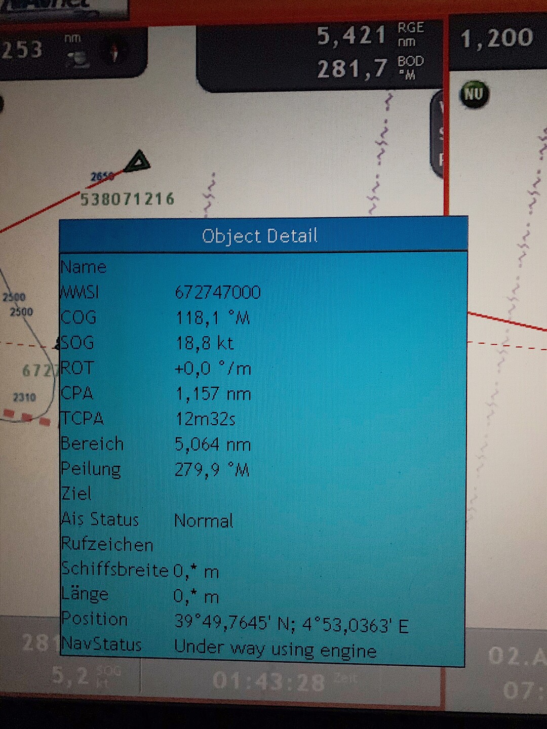 Da wir am Mittwoch Abend losgefahren sind, bedeutete das zwei Nachtfahrten und eben den Tag dazwischen. Nachtfahrten auf offener See sind schön, ganz besonders in warmen klaren Nächten. Meist gibt es hier nicht so viele Gemeinheiten zu beachten wie etwa Stellnetze, Fischerfähnchen und Flachs, Felsen oder schwach beleuchtete Angelboote, die Nachtfahrten in Küstennähe deutlich schwieriger machen. Die Lichter der Schiffe weit draußen kann man meist schon von weitem sehen. So sind die großen Pötte nachts oft aus größerer Entfernung auszumachen als am Tage. Außerdem haben praktisch alle AIS, sind also auf unserem Plotter zu erkennen. Und der sagt einem dann eine ganze Menge zu den Dampfern an: natürlich Kurs und Geschwindigkeit (kann man auch schon an den Pfeilen erkennen) , aber auch z.B. die größte Annäherung bei den bestehenden Kursen (CPA), also ob man sich zu nahe kommt. Man kann sogar automatische Annäherungswarnungen programmieren.
