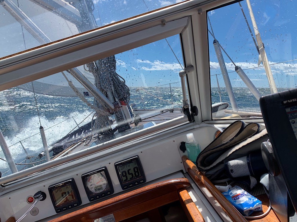 Der 130 sm-Schlag hinunter von Port Clyde in Maine nach Provincetown auf Cape Cod in Massachusetts beginnt ziemlich rau, aber das war abzusehen. Einmal mehr scheint die für die Böen in der Wettervorhersage von Windy angegebene Wert quasi durchgängig vorzuherrschen und so haben wir zunächst Wind von stets über 25 kn. Bei einem scheinbaren Windeinfallswinkel von meist zwischen 60 und 90 Grad kommen wir mit der Fock und zwei Reffs im Groß gut voran, aber durch die etwa 1,5 m Welle fühlt es sich an wie eine Kopfsteinpflasterautobahn.