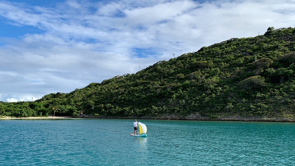 Mit den SUP paddeln wir in der Bucht herum, gegen den Wind ein ziemliches Workout. Und zurück, vor dem Wind? Da geht doch was 🤔.