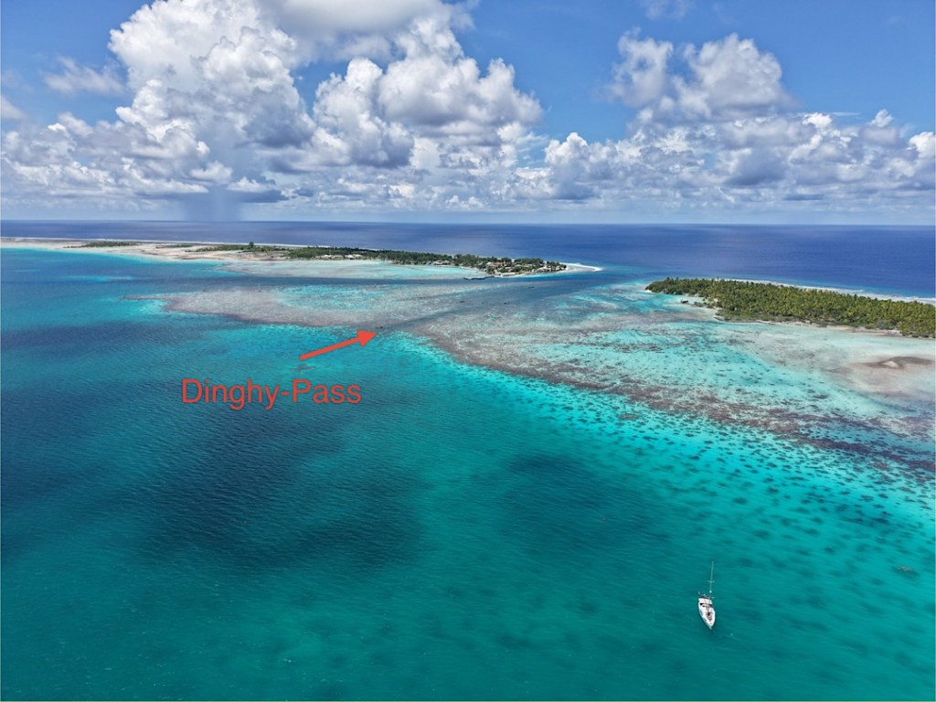 Wir ankern hinter dem Motu direkt zwischen dem Nordpass und dem breiteren Hauptpass, durch den wir ins Atoll gefahren sind.