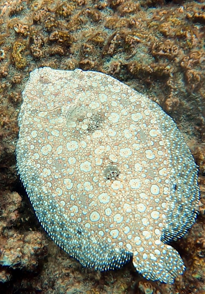 Aber hier im Pass begegnen uns auch Meeresbewohner, die wir bisher noch überhaupt nicht gesehen haben, etwa dieser wunderschöne Pfauenaugen-Butt: