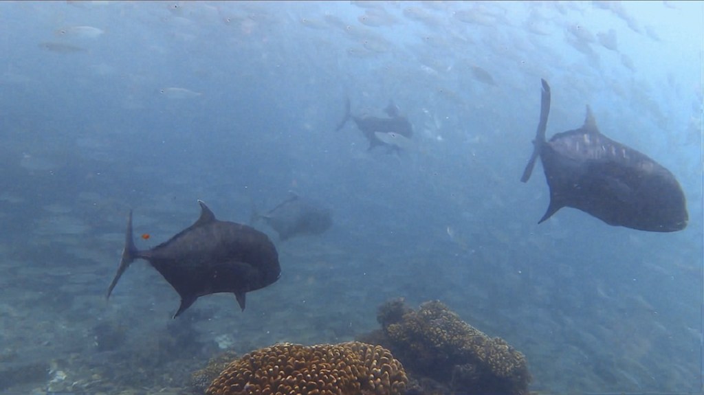 Damit nicht genug, ein riesiger Schwarm von Großaugen-Heringsmakrelen (Big Eye Scad) kommt auf uns zugeschossen. Sie fliehen vor mehreren deutlich über einen Meter großen Trevally, die immer wieder durch den Schwarm jagen.