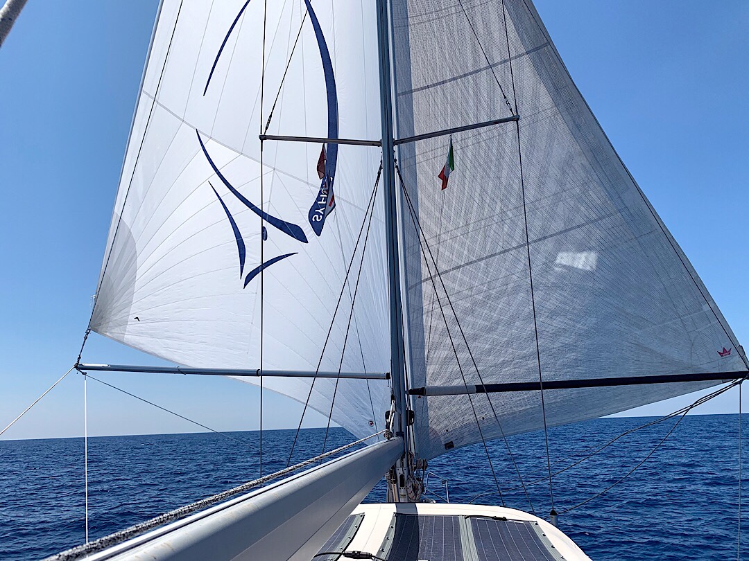 Gestern und heute haben wir auf unserem Schlag von Sizilien nach Sardinien jetzt erstmals ausprobiert, ob wir ihn wie geplant auch als „Passatsegel“ einsetzen können: von drei Uhr nachmittags bis drei Uhr nachts stand er (gemeinsam mit der ebenfalls ausgebaumten Genua) ununterbrochen bei mal mehr, mal weniger Wind und Windwinkeln, die auf beiden Seiten zwischen 150 und 180 Grad pendelten, also letztlich um 60 Grad schwankten, ohne dass wir nachgetrimmt hätten. Und so sah das aus: