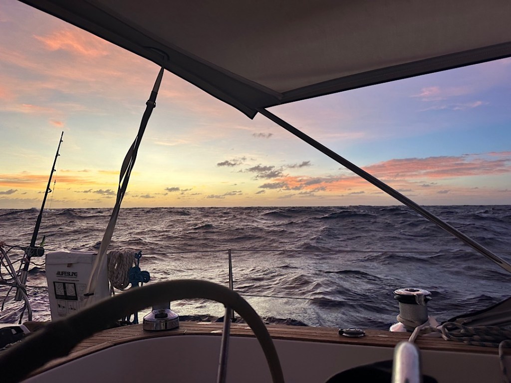 Gegen Abend nimmt der Wind zu, mit ihm auch die Wellen, aber auch unsere Geschwindigkeit. Mit der Fock und zwei Reffs im Groß geht es in die erste Nacht dieser Passage. Weil es ja mit rund 72 Stunden eine überschaubar kurze Überfahrt wird, experimentieren wir mit unserem Wach-Rythmus. Statt 4 mal 3 Stunden in der Nacht probieren wir es ausnahmsweise mit 2 x 6 Stunden. Aber so richtig glücklich sind wir damit nicht.