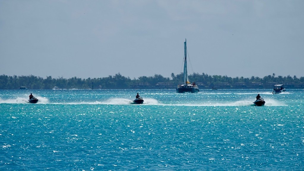 Fairerweise halten sie aber offenbar – anders als etwa in Moorea – meist gebührenden Abstand. Das ist auch vergleichsweise leicht möglich, die Lagune um die Insel bietet reichlich Platz. Auch für uns, die Bojenfelder sind mit großzügigen Abständen gesetzt und unseres ist nur spärlich belegt, zeitweise liegen nur ganze drei Boote hier.