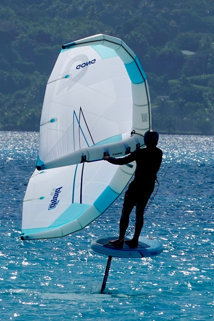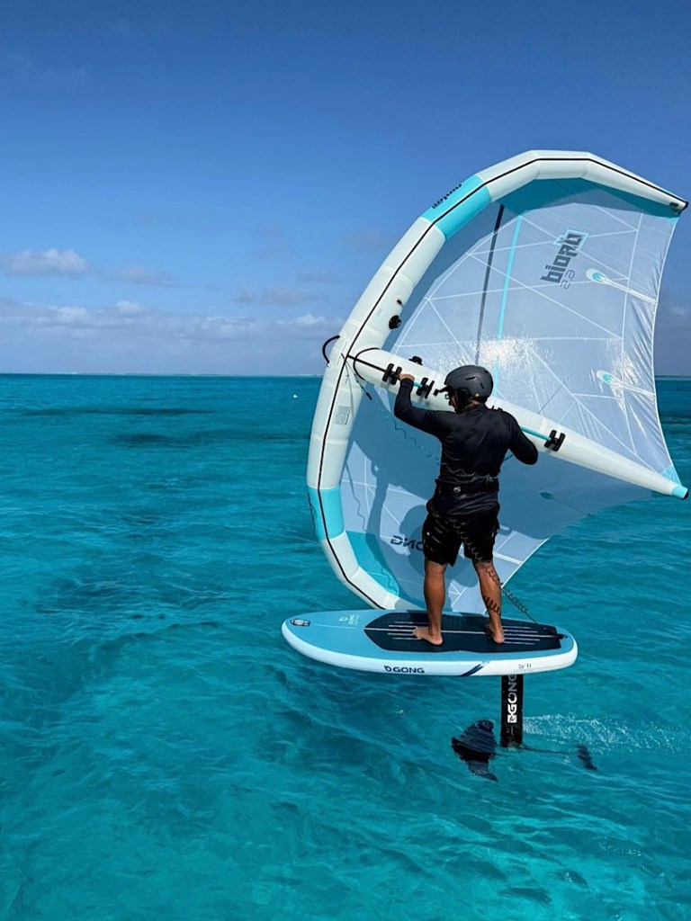 Auch zum Wingfoilen gibt es reichlich Raum und Gelegenheit, Elisa tastet sich da mit ersten Übungen mit dem Wing auf dem Paddelboard und später auch auf dem Foilboard langsam ebenfalls heran.