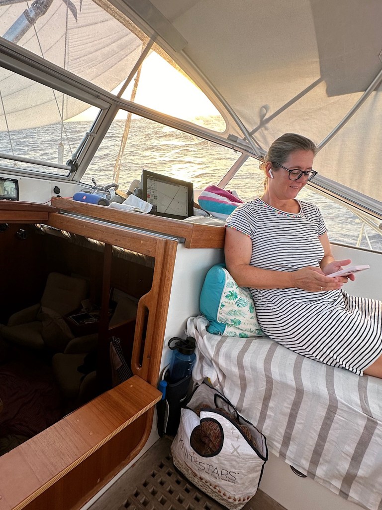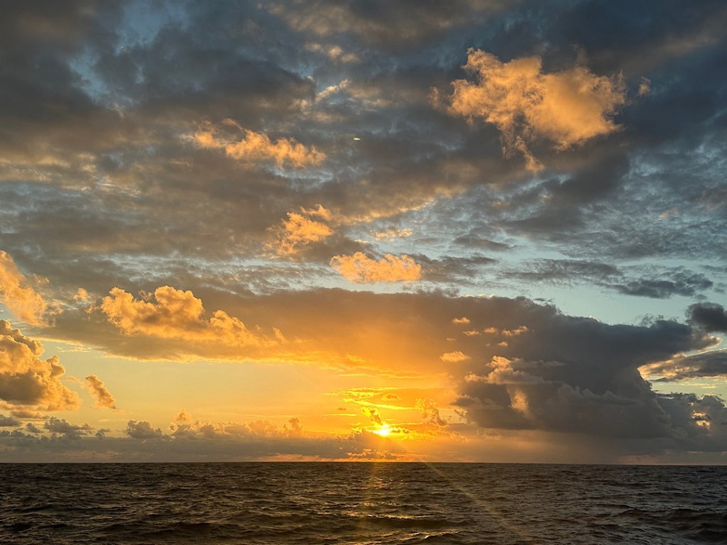 Das Schöne daran: die Vorhersage der Meteorologen tritt ein, das Band löst sich bei unserer Annäherung ganz langsam vor uns auf, die Reste ziehen ab. Sehr schön. Was bleibt, sind natürlich einige Schauer, Winddreher und auch ein bisschen Kabbelsee, vor allem in der Nacht. Und heute können wir entgegen der Erwartung eines ausgeprägten Schwachwindgebietes wiederum (jedenfalls bisher) auch immer wieder längere Abschnitte segeln, bei babyblauem Himmel vor uns und tiefblauem Ozean (und einer dunkelgrauen Wolke hinter uns).