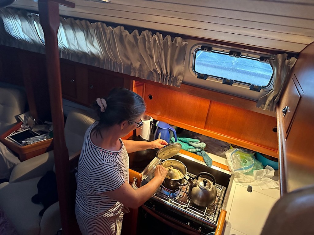 Wind- und wettermäßig bekommen wir heute einiges geboten. Schwachwindsegeln, kurze Motorpassagen, kräftige Böen, aber auch zeitweise herrliches Segeln, alles ist dabei. Außer – dreimal auf Holz geklopft – Gewitter. Wir scheinen es ganz gut abgepasst zu haben.