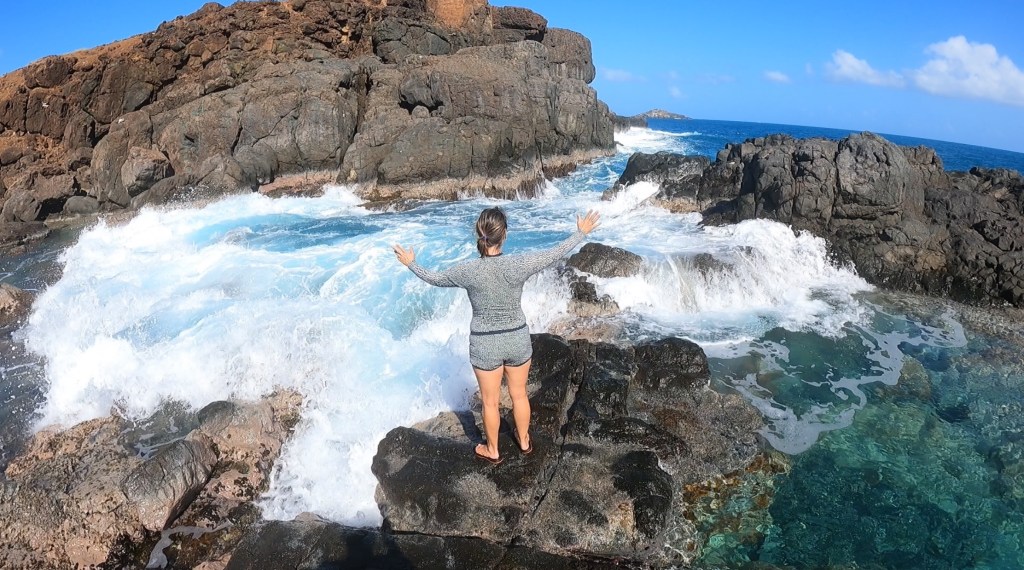 Rund Culebra zunächst mal. Wir verlassen unsere wunderbare Bahia Tortuga auf Culebrita, allerdings nicht ohne vorher noch einmal einen Spaziergang über den Strand hin zu den „Pools“ am Montecito Primero zu machen. Die felsige Nordspitze der Insel wird hier von immer mal wieder durch die Brocken flutenden Wellen quasi abgeschnitten. Dabei bilden sich mehrere Pools, teils ganz ruhig, teils echte Wellenbäder.