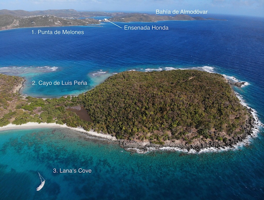 Vorsichtig brechen wir gemeinsam mit der Easy-One schon morgens um 9.00 in der Sun Bay auf, es ist in dieser eigentlich geschützten Bucht mit zunehmendem Südost-Wind doch etwas rollig geworden. Wir sind uns nicht sicher, ob der Schutz an unserem angedachten Ankerplatz besser sein wird, durch die frühe Abfahrt könnten wir zu Not einfach weiter nach Westen zur Hauptinsel Puerto Rico weitersegeln.