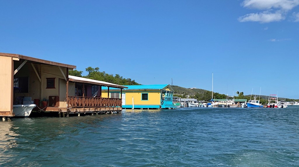 Da fahren wir doch lieber etwas weiter hinein in die Bucht, näher an den Ort. Tja, aber Sonntagmittag sausen da natürlich auch die Motorboote und Jetski herum. So ist das hier nunmal am Wochenende, anders als in den meisten Windward oder Leeward Islands haben nicht nur Fischer sondern auch viele andere Einheimischen hier Boote, gut motorisierte Motorboote zumeist, und die wollen schließlich auch bewegt werden. Außerdem gibt’s auch Leih-Motorboote und Leih-Jetski für die vielen (jedenfalls derzeit zumeist puertoricanischen) Touristen. Von denen wimmelt auch die Stadt, die vielen Restaurants sind gut besucht. Es geht aber diszipliniert zu, auf der Straße werden konsequent Masken getragen, im Restaurant oder Geschäft müssen zuerst die Hände desinfiziert werden, die maximale Zahl der Kunden ist jeweils auf einem Schild am Eingang eingetragen und wird – soweit wir das beurteilen können – eingehalten. Trotzdem, anders als die bunten Stelzenhäuser in den Mangroven spricht uns der innere Teil des geschäftigen La Parguera nicht so recht an.