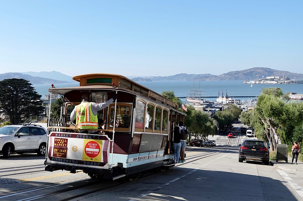 Wir nehmen ein Cable Car und fahren vom Marina District über die steilen Hügel von Russian Hill und Nob Hill. Dort macht unsere Linie einen Haken und führt dann weiter zur Market Street, einer der Haupteinkaufsstraßen in Downtown San Francisco.