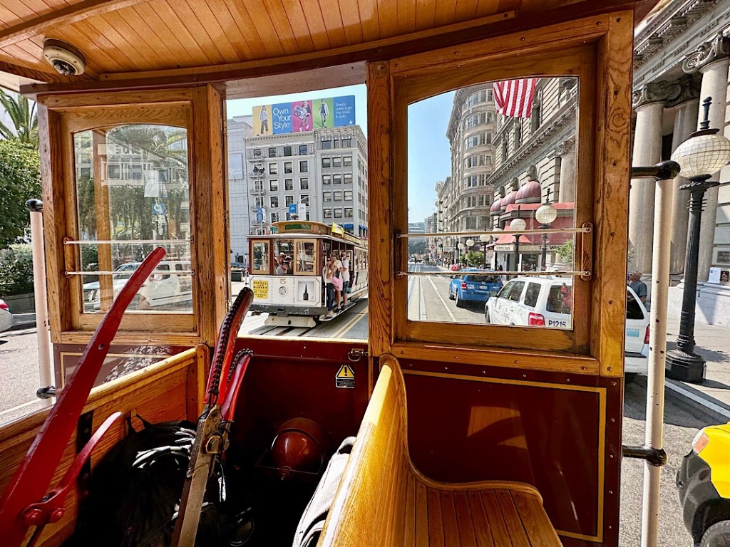 Unterwegs im Cable Car sieht der Platz des Gripman zwischen den Sitzen so aus: