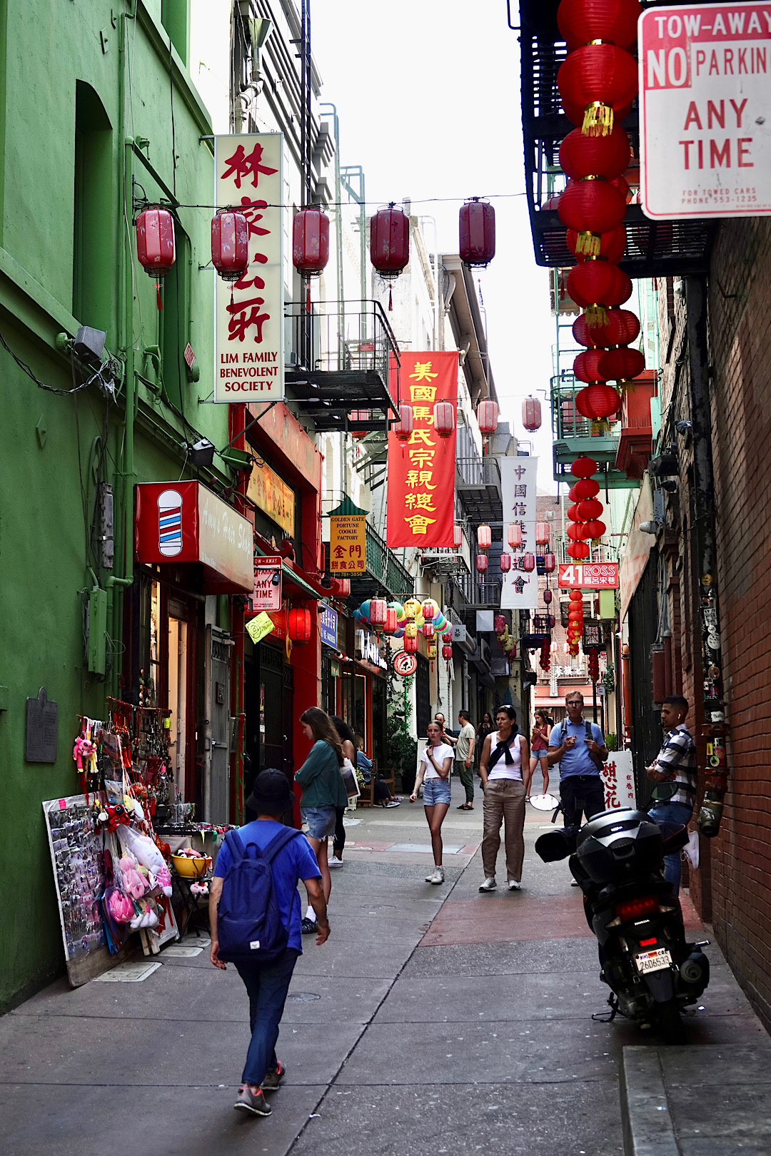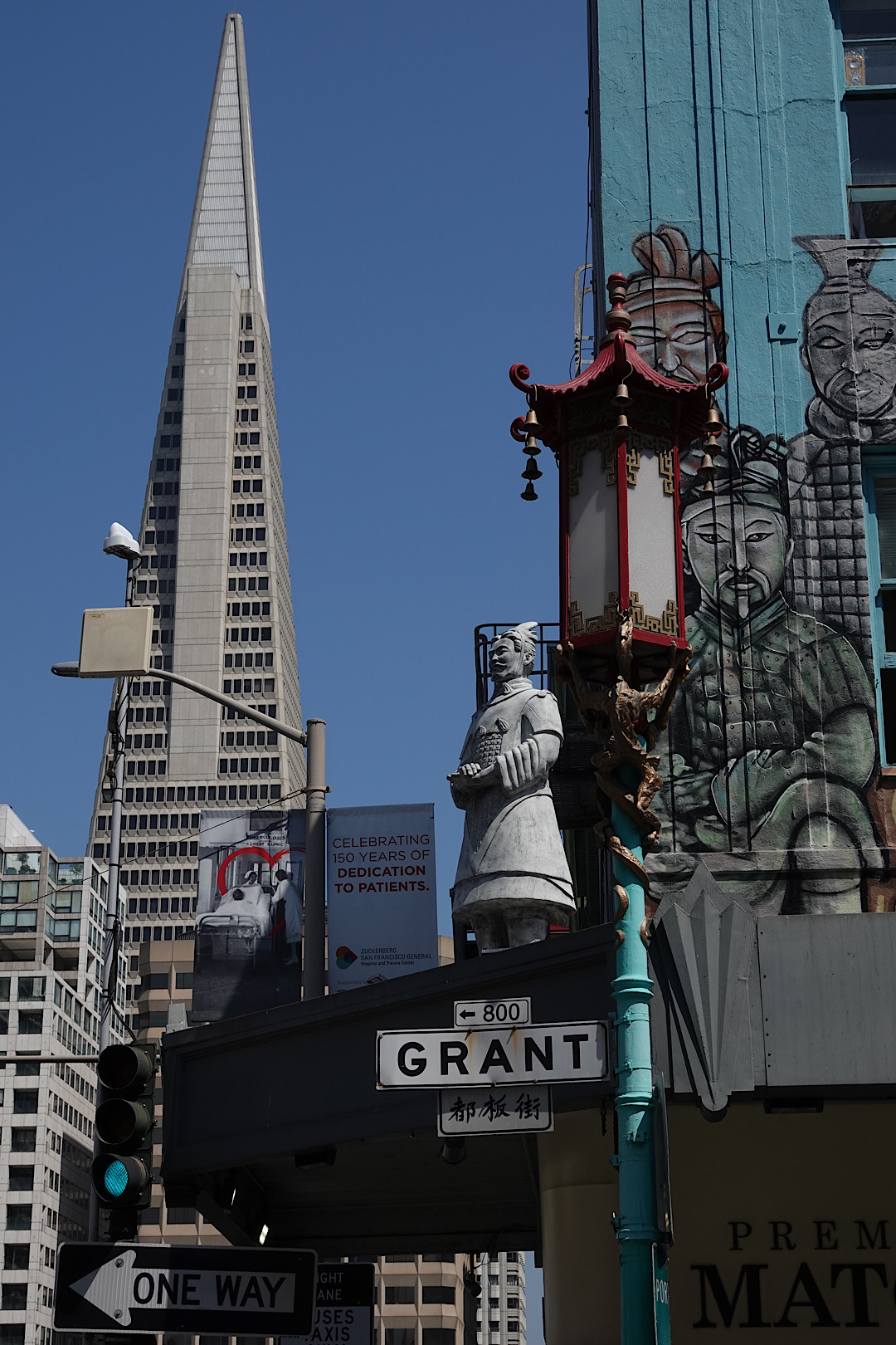 Unser Ziel ist Chinatown, dass sich in mehreren Straßenzügen vom Financial District bis hinauf nach Little Italy um Telegraph Hill und North Beach hinzieht. Manchmal geht der Blick hinunter zum Wasser, wo mit der San Francisco-Oakland-Bay Bridge die größere Schwester der Golden Gate Bridge grüßt.