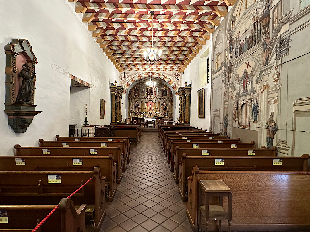 Am nächsten Tag nehmen wir vom Marina District den Bus der Linie 49. Die Nummer der Linie ist Zufall, aber ein witziger. Schließlich stehen die „San Francisco 49ers“ als NFL American-Football-Team ziemlich weit oben auf der Bekanntheitsliste in diesem Sport. Der Name hebt übrigens nicht auf das Gründungsjahr ab (das war erst 1946) sondern auf 1849 als das Jahr des kalifornischen Goldrausches, dass San Francisco einen kometenhaften Aufstieg bescherte. Und auch uns bringt die 49 zu den Ursprüngen der Stadtentwicklung. Wir fahren in den Stadtdistrikt „Mission“. Benannt ist er nach der ab 1776 erbauten katholischen Mission Dolores. Diese spanische Missionsstation wurde zwar gemeinhin Mission Dolores (nach dem benachbarten Flüsschen) genannt, war offiziell aber nach dem heiligen Franz von Assisi benannt. Und – na klar – sie war der Ursprung der sich in der Folge langsam, ab 1849 dann aber sprunghaft entwickelnden Stadt San Francisco. Das älteste noch existierende Gebäude der Stadt ist denn auch als zweite größere Gebäudestruktur der Mission bereits 1791 eingeweiht. Dieser alten Missionskirche wurde später eine neue zur Seite gestellt, die allerdings anders als das Altgebäude dem Erdbeben von 1906 zum Opfer fiel und 1918 durch eine verspielt dekorierte Basilika ersetzt wurde.