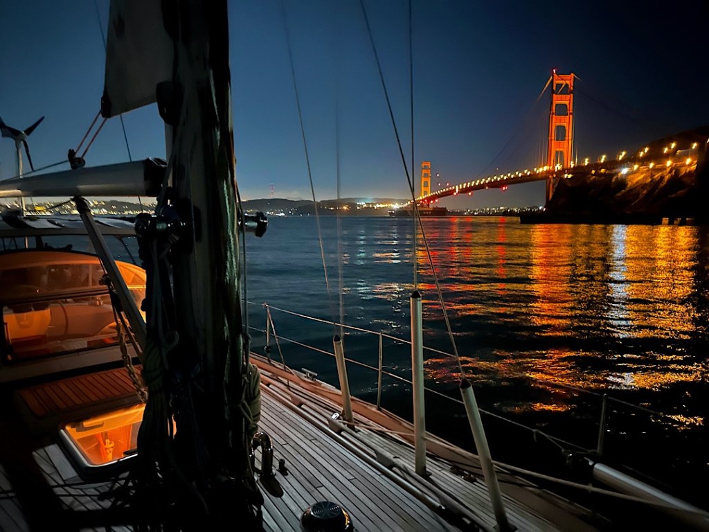 Superlecker. Wir lassen den Abend an Bord ausklingen, mit Blick auf die illuminierte Brücke, die von Yerba Buena nach Oakland hinüber führt.
