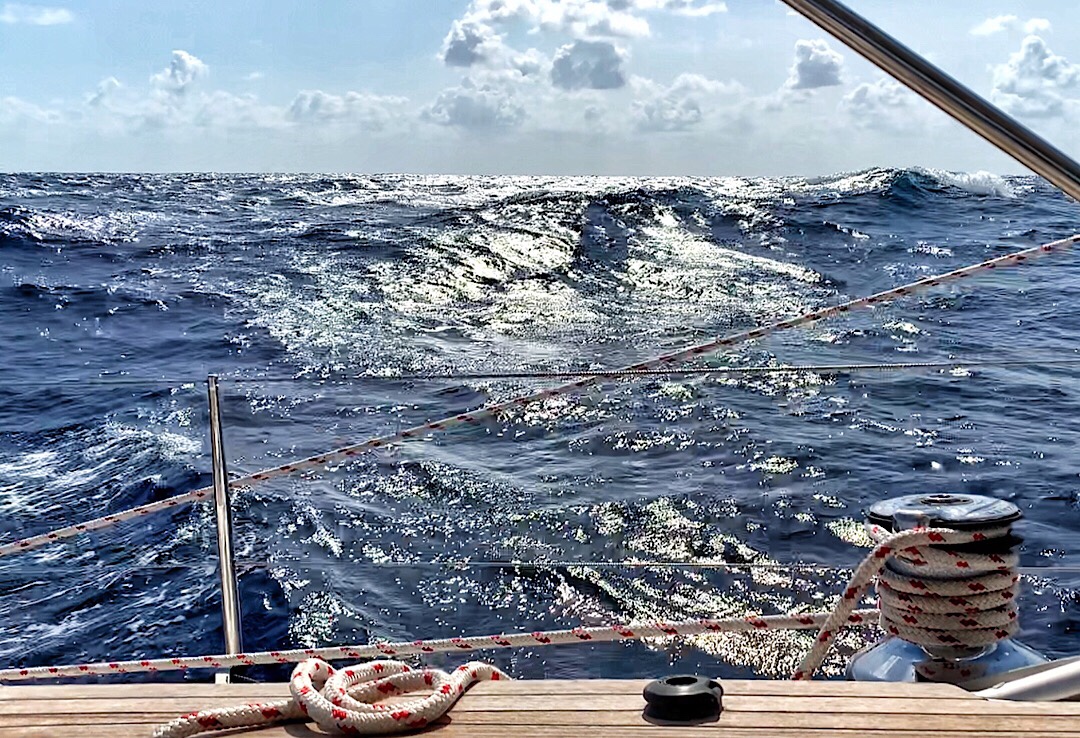Die Bedingungen sind gut, um sich in die Passage einzugewöhnen. Nicht allzu schaukelig, etwa 2 m seitliche Ozeanwelle. Erst Segeln wir auf Steuerbordbug mit Fock und Großsegel, seit heute früh ist die Fock an Backbord ausgebaumt. Schmetterlings-Segeln.