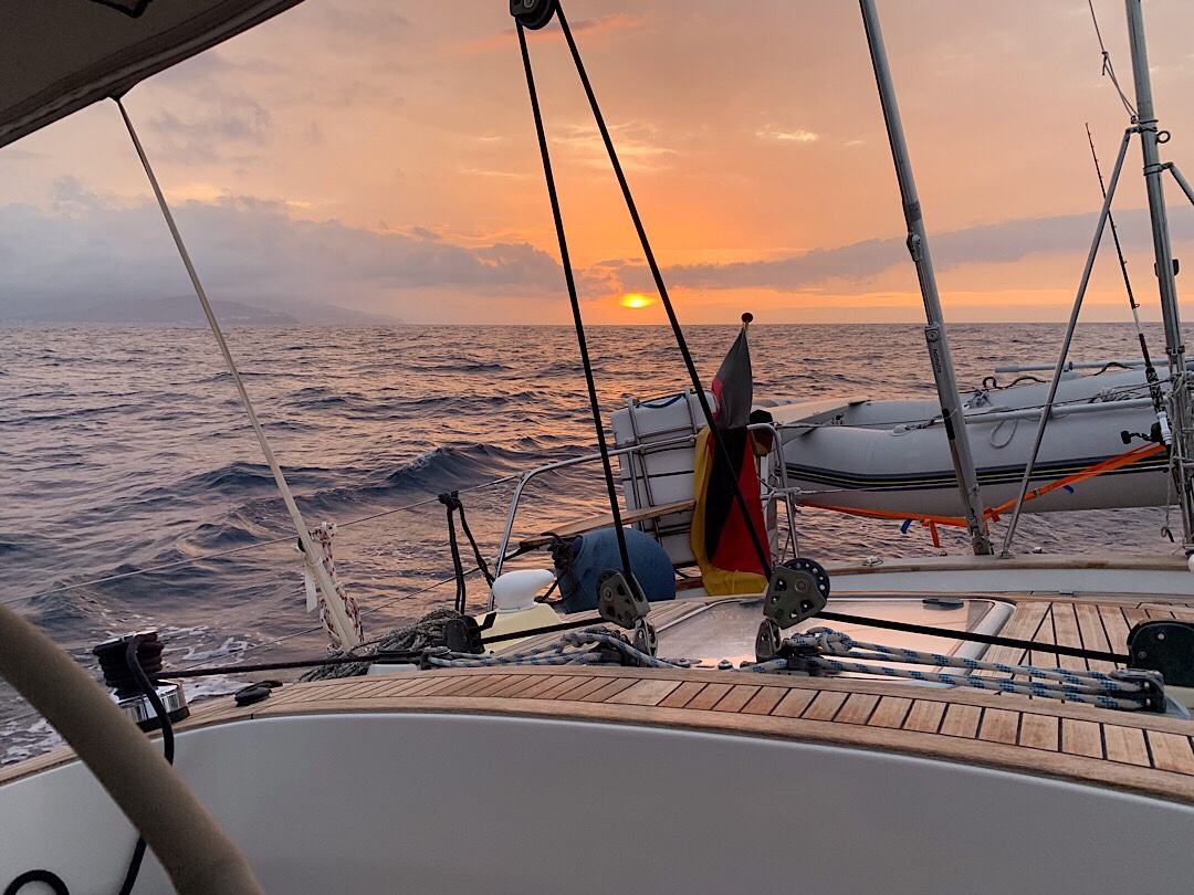 Der „lange“ Schlag von 190 sm, den wir wettervorhersagebedingt von Cartagena aus eingelegt haben, erweist sich als richtig gute Entscheidung. Der Wind ist kräftig, kommt aber ziemlich achterlich. Also quasi eine weitere Trainingseinheit für den Passat. Angesagt sind zunehmende Winde, die in den Böen abends 25 zunehmend auf 30 kn erreichen. Genauso kommt es auch. Wir segeln Schmetterling mit der Fock und Groß, gehen zwischenzeitlich mit dem Groß ins zweite Reff und haben trotz der Welle und in der Spitze 31,3 kn wahrem Wind auf der Windanzeige einen nicht allzu schaukeligen angenehmen Törn.