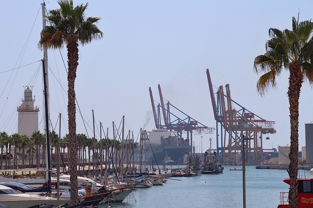 Die S-Bahn hat uns in 40 Minuten mitten ins Zentrum gebracht, wir konnten Málaga dadurch gut zu Fuß erkunden. Die schöne Altstadt beginnt gleich am Hafen, der aber mehr Handels- und Fährhafen ist, auch wenn es am östlichen Kai malerisch vor Palmen, Leuchtturm und Hafenkränen gelegene (schwellige und teure) Liegeplätze und weiter draußen auch einen (ebenfalls teuren) Yachthafen gibt.