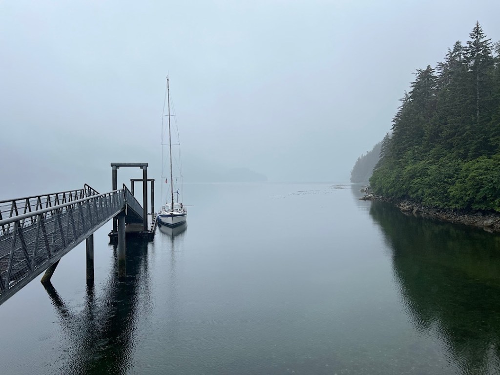 Nach fast 10 sm, kurz bevor die Lisianski Strait auf den Lisianski Inlet trifft, gibt es “irgendwo im nirgendwo” einen massiven Schwimmsteg, an dem wir die Flora festmachen.