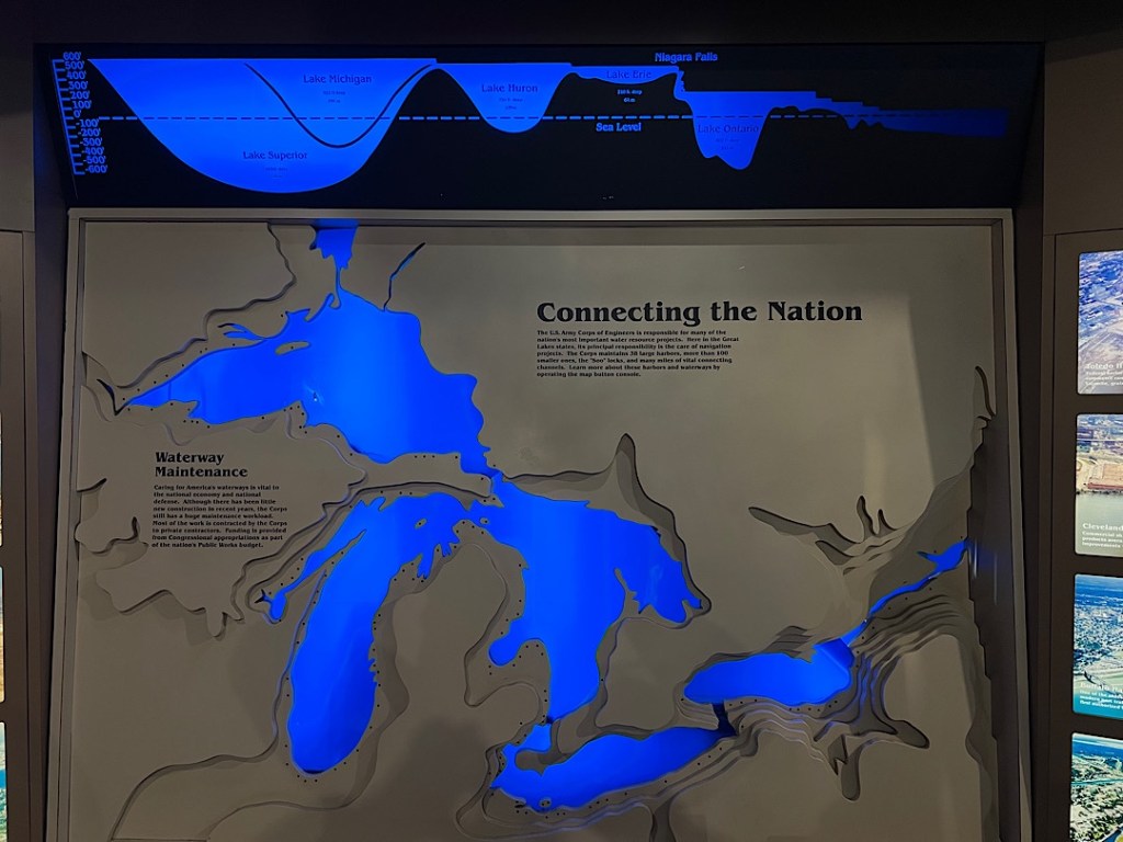 Das obere Schaubild zeigt das Volumen der Seen (das etwa dem der Ostsee entspricht) und die unterschiedlichen Höhenlagen einschließlich der sich daraus ergebenden Niagara-Fälle. Das untere Relieffpanorama macht auch deutlich, wie wir uns hier, am Ostende des Lake Superior (Oberer See) relativ zu Lake Michigan, Lake Huron, Lake Erie und Lake Ontario befinden.