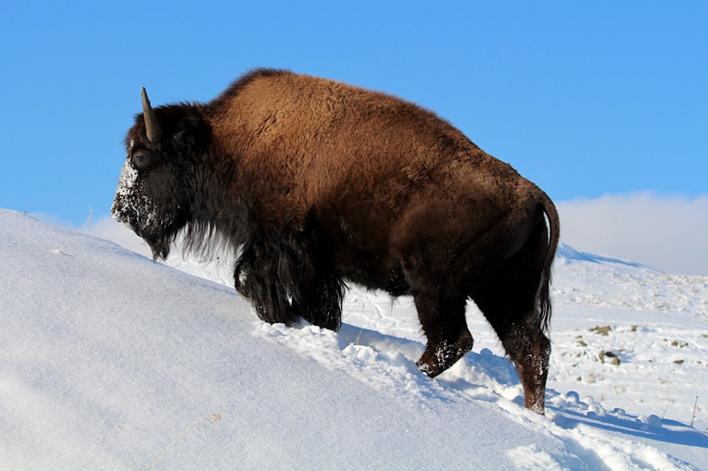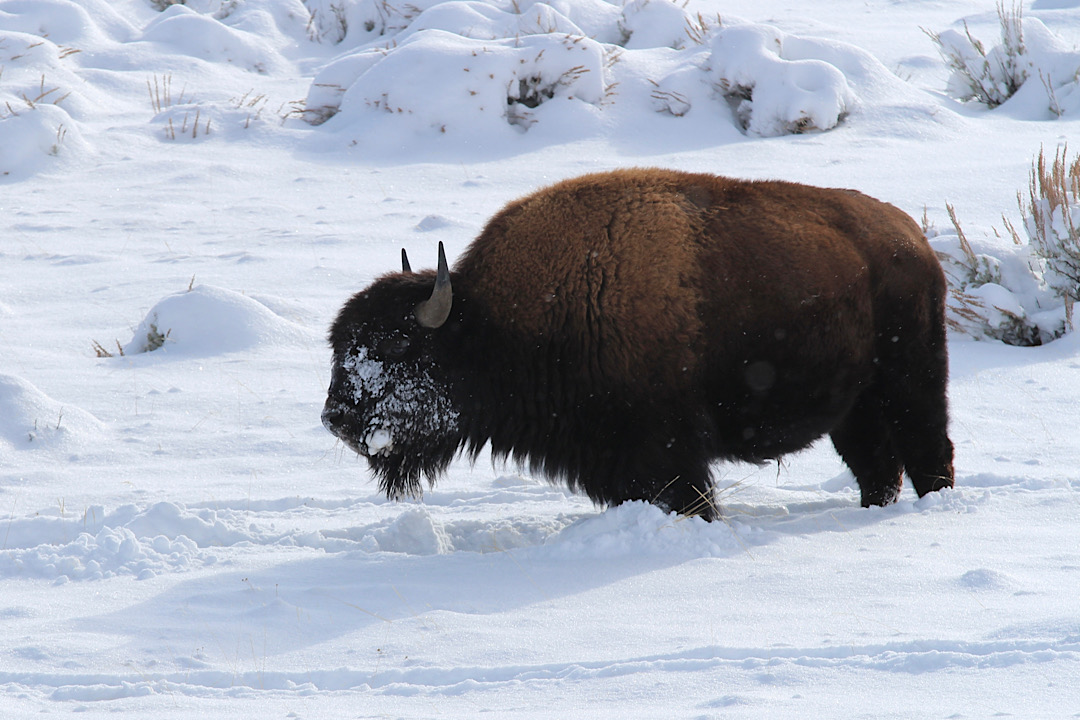 Über 5.000 Bisons leben heute im Yellowstone Nationalpark, die größte von insgesamt 62 über den Kontinent verteilten Populationen. Das größte Landsäugetier Amerikas hat überlebt, und wir bekommen es auch zu Gesicht. Eine ganze Herde einschließlich einiger Kälber sucht auf dem Rücken eines Hügels Fressbares unter dem Schnee.
