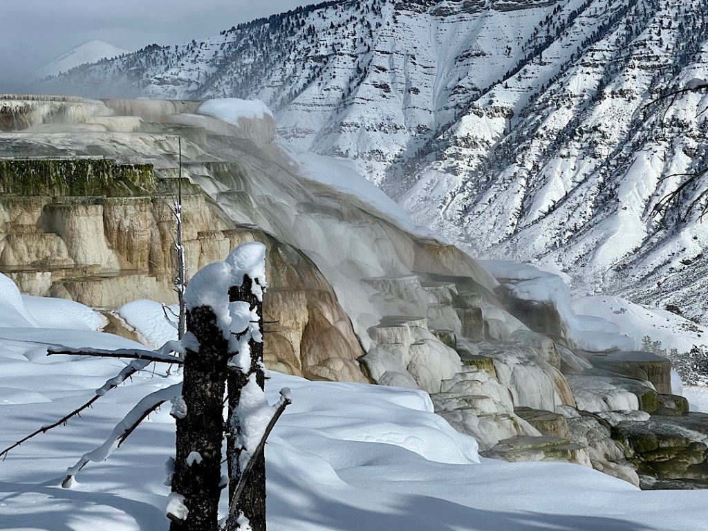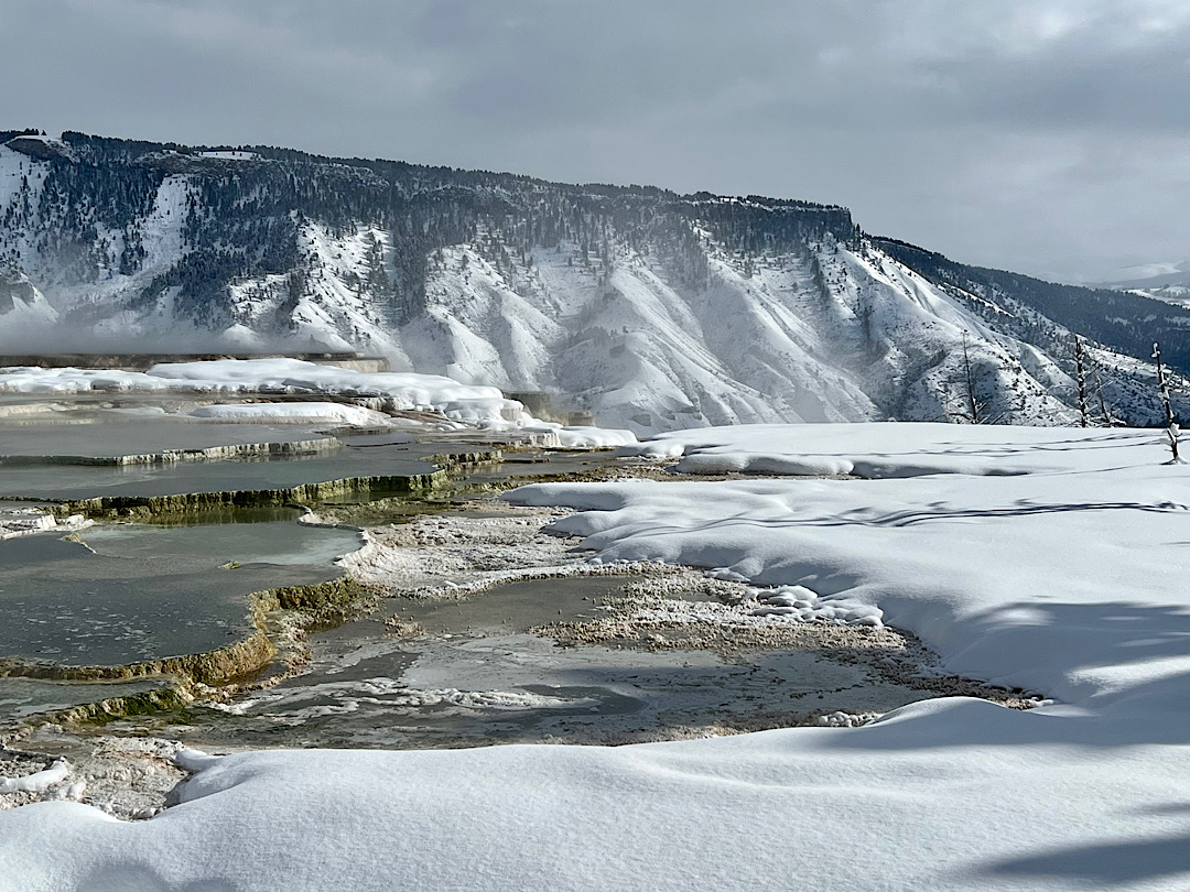 Im Park selbst dann noch viel mehr Dampf in der Luft, denn die Mammoth Hot Springs machen ihrem Namen Ehre.