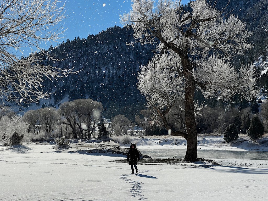 Schon die Anfahrt von Livingston führt am Yellowstone River entlang. Raureif auf den Bäumen, den der Wind gelegentlich herum bläst. Glitzer in der Luft, dazu Dunst vom warmen Fluss in der eisigen Kälte von anfangs -17 Grad Celsius.