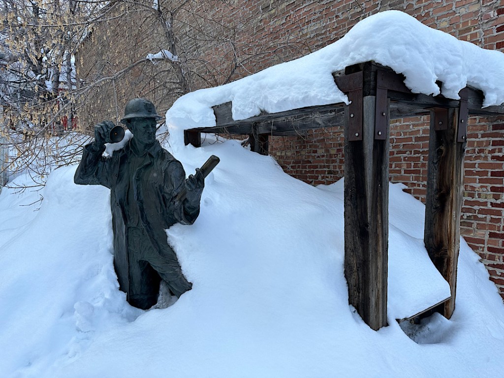 Selbst der Bergmann, dessen Statue an die Ursprünge der Stadt erinnert, präsentiert sich fast schon eingedeckt von fluffigem „Powder“.