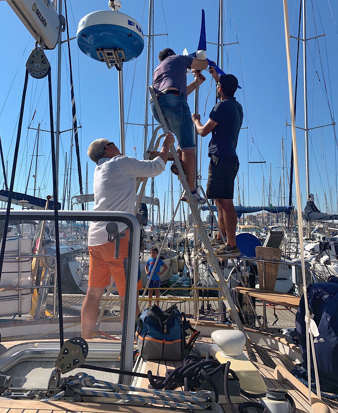 Und er musste es ja allein richten, denn die Solarpanele hatten wir ja schon gestern vorsorglich abgebaut, ebenso wie das Bimini auf dem sie montiert sind.