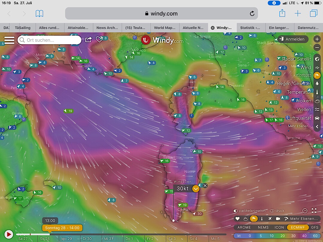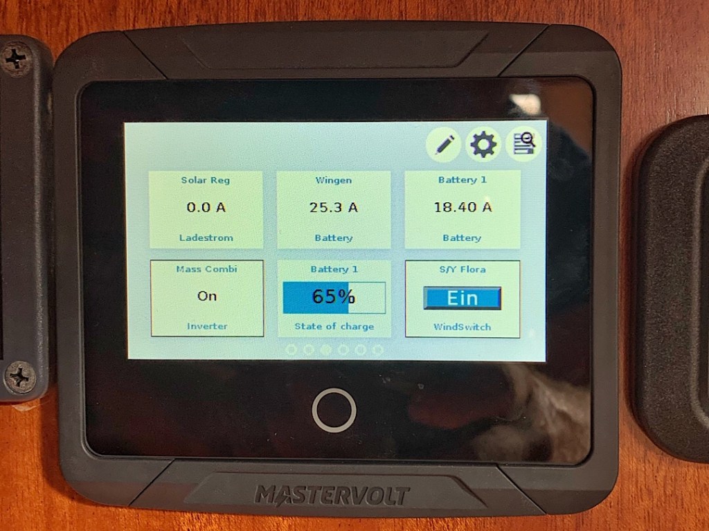 Die Böen liegen jetzt bei uns nicht mehr deutlich über 30 kn, dass merken wir auch an einem dauerhaft laufenden Windgenerator. Zuvor hatte unser “Silentwind” nämlich eine echte On-Off-Beziehung: immer wieder ging er in die automatische Abschaltung und lief erst nach etwas Wartezeit wieder an. Aber wenn er roulierte, dann richtig. In der Spitze zeigte das Display Ladewerte von über 25 Amp.