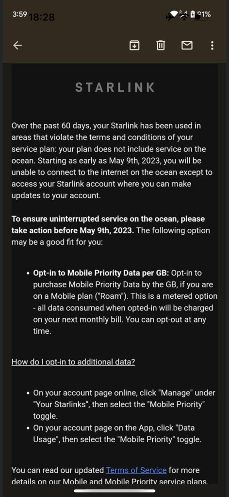 Update 02.05.2023: Nachdem über “Maritime Mobility 50 GB”-Option einige Verunsicherung herrschte, hat Starlink eine weitere Tarifoptionen herausgebracht: eine Ergänzungsoption für Priority-Daten, die dann auf dem Ozean nutzbar sind. Preis etwa 2 Dollar pro GB. Starlink hat mit der nachfolgend abgebildeten Nachricht dann auch gleich ordentlich Druck gemacht (wie oben ja bereits vermutet). Das Gute an der Option ist, dass sie beliebig ein- und ausgeschaltet werden kann. Ist man also “an Land” (das heißt, in einem der Starlink Hexagonalbereiche, die auf der Starlink-Verfügbarkeitskarte nicht schwarz sind) schaltet man die Option aus und der eigene “normale”Tarif bietet die “normale” Starlink-Versorgung.