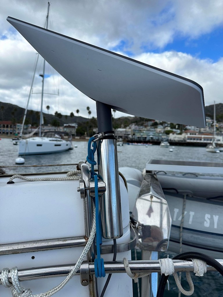 Die Stange von Dishy wurde für einen festeren Sitz leicht aufgepolstert und zusätzlich mit einer gummierten Schlauchschelle gesichert, die zudem am Heckkorb festgelascht wurde. Hat sich inzwischen (Stand Mai 2024) auf einigen Seepassagen nach Mexiko und weiter nach Französisch Polynesien) bewährt.