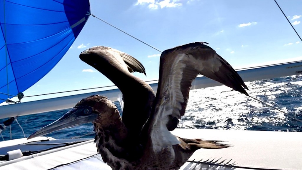 Interessanterweise haben wir dabei Zuschauer. Mehrere Boobies fliegen die Flora an und versuchen auf ihr ein Plätzchen zu ergattern. Nachdem uns kürzlich einige Vögel von der Saling aus das ganze Deck und das Bimini samt Solarpanelen zugekotet haben (im wahrsten Sinne des Wortes ätzend), sind wir darüber allerdings nur mäßig erfreut.
