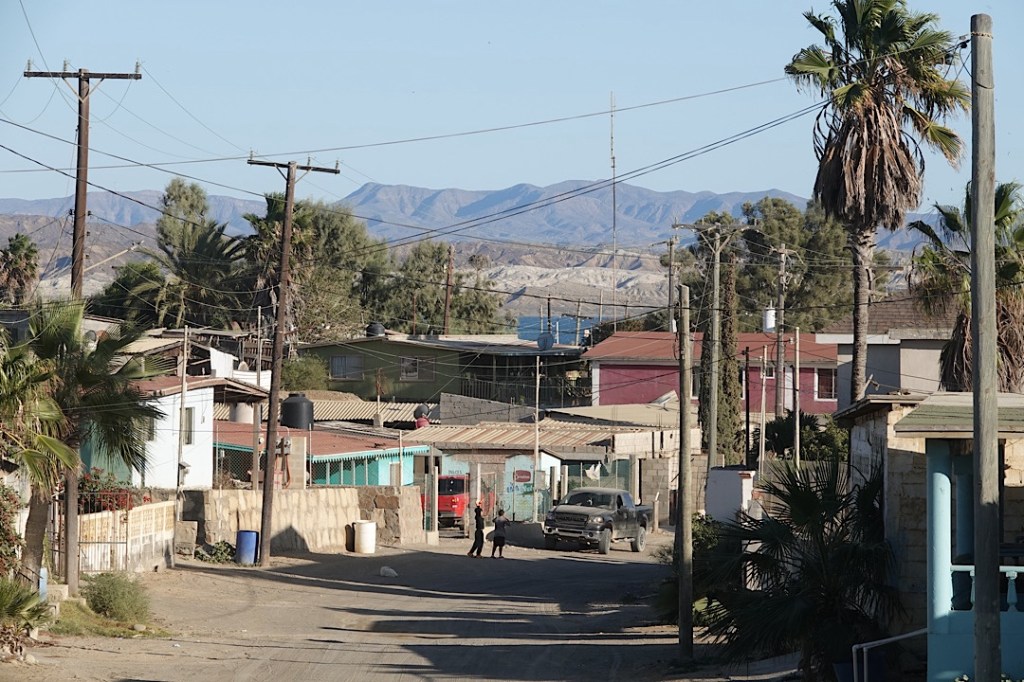 Angekommen in der Provinz der auch für mexikanische Verhältnisse abgelegenen wüstenähnlichen Baja California. In dem entspannten kleinen 2.600 Seelen-Ort ist die Hauptstraße befestigt, fast alle anderen sind Sandwege. Entsprechend viel Staub ist in der Luft und der muss ja irgendwie heruntergepült werden.