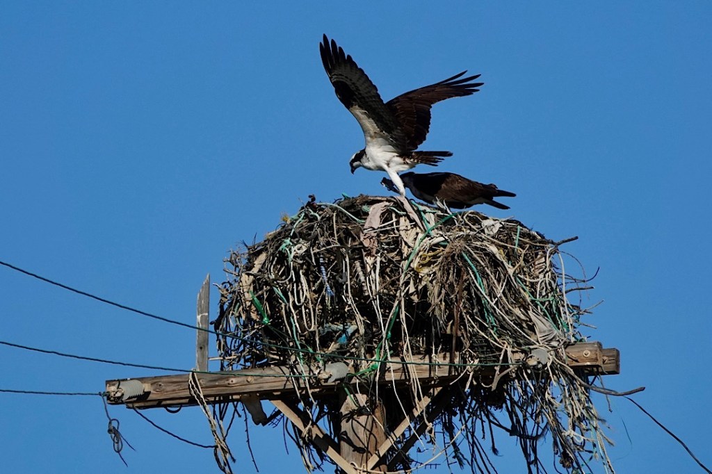 Und auch Fischadler sind erstaunlich zahlreich. Allerdings haben sie in dieser außerhalb des Ortes baumlosen Landschaft Probleme, ihre Nester wie anderswo üblich aus Zweigen zu bauen. Bei genauem Hinschauen wird deutlich, dass dieses Nest auf dem Strommast zu einem großen Teil aus Netz- und Leinenresten besteht, sicher nicht ungefährlich für die Vögel und ihren Nachwuchs.