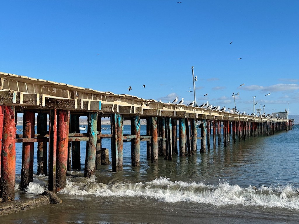 Die ins Meer hinausgebaute Pier macht mit den fehlenden, weggerosteten und geflickten Stützen keinen allzu Vertrauen erweckenden Eindruck. Aber als wir gerade diskutieren, ob sie noch betreten werden kann, fahren zwei Auto drauf. Hm. Die Locals haben da offenbar andere Vorstellungen als wir.