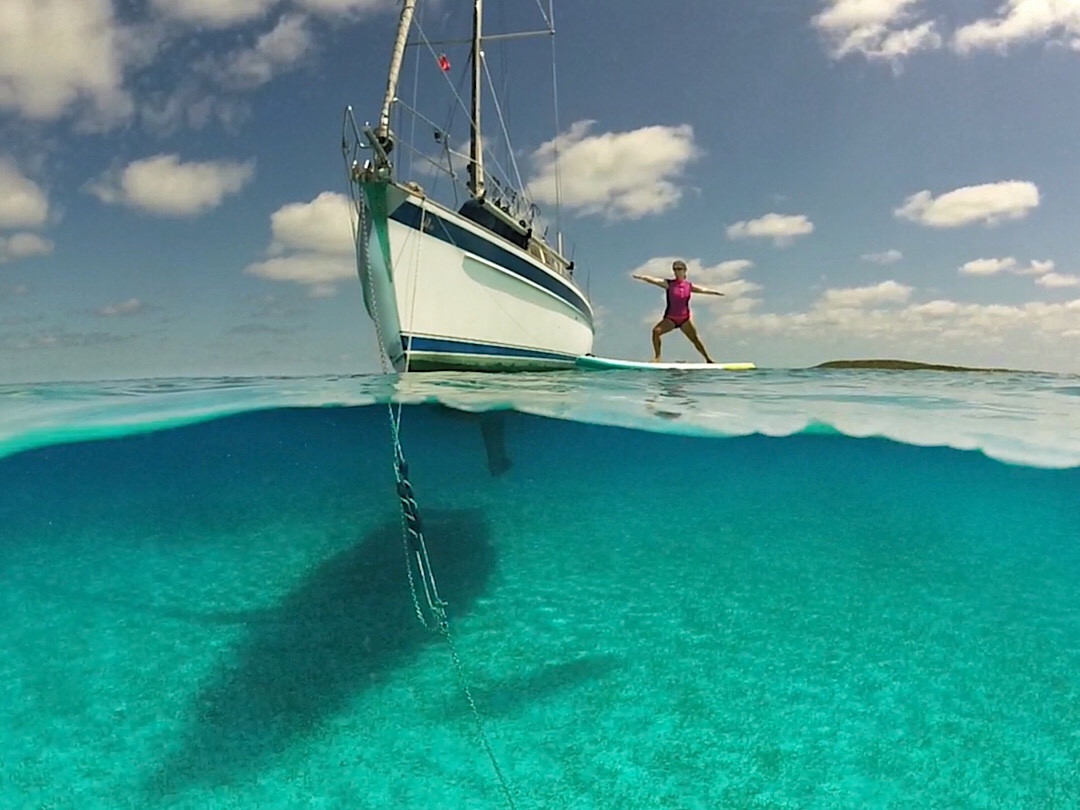 Am nächsten Morgen läuft Amalia früh aus, Steve und Helena müssen einiges erledigen und brauchen dafür Internet, sie segeln ab in Richtung Exumas. Wir anderen bleiben noch etwas auf Water Cay, genießen die spektakuläre Felsenkulisse am Ankerplatz und das ruhige, glatte Wasser. Endlich mal wieder werden die SUP aufgeblasen und wir paddeln herum. Wiebke kann wieder mal Yoga auf dem Board machen.