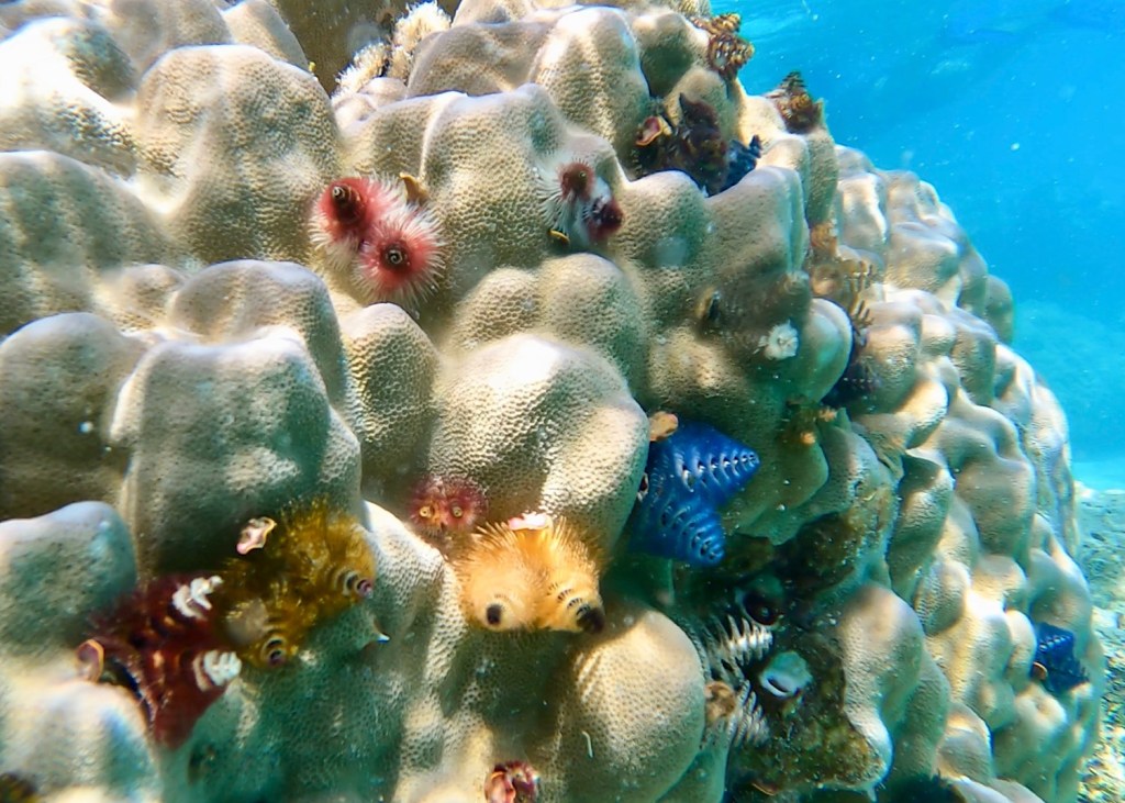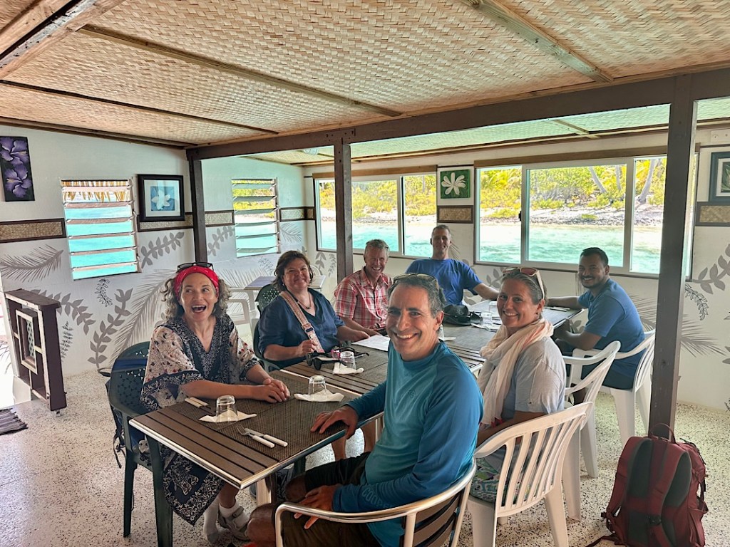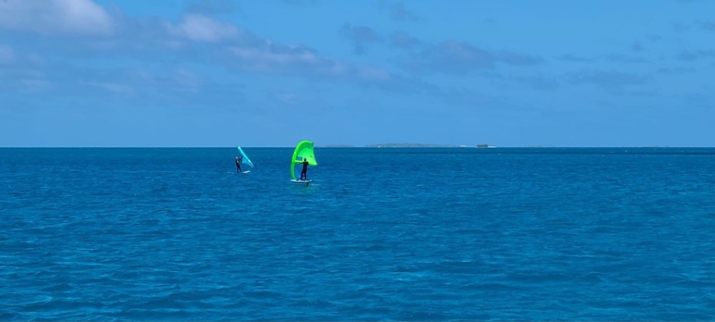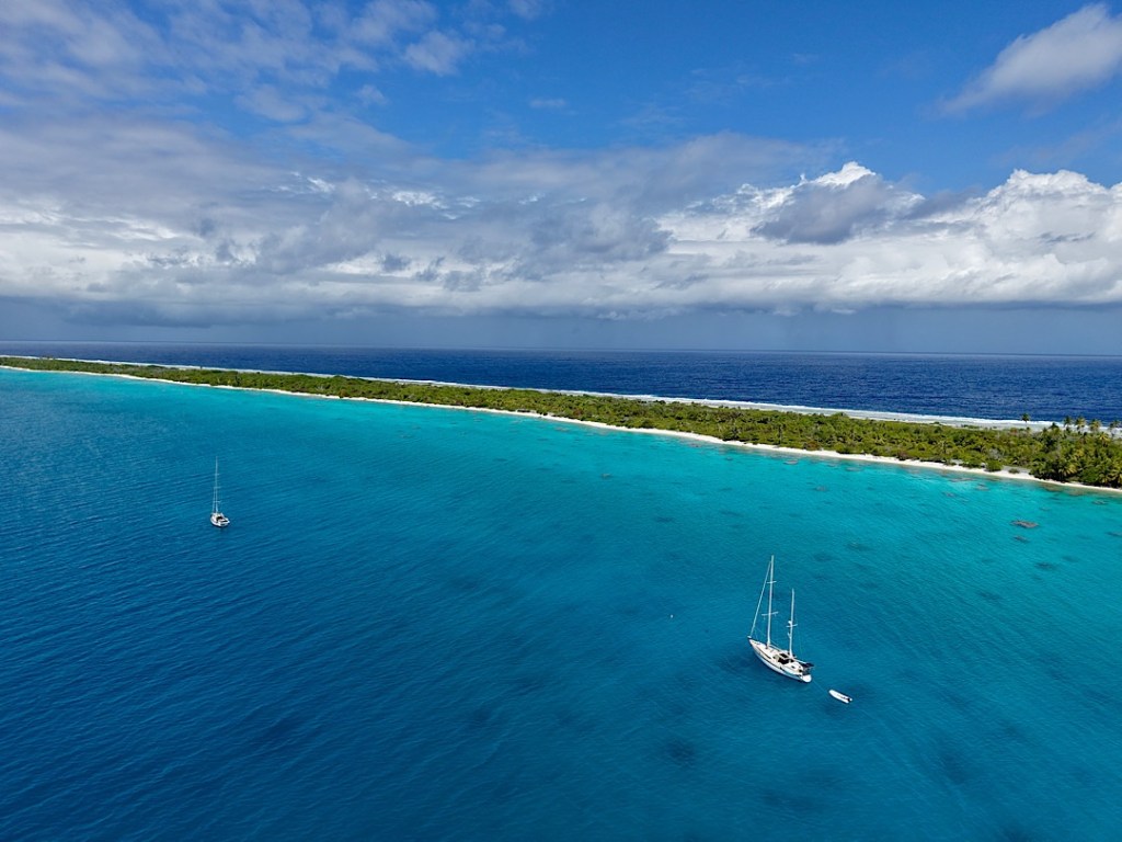 Die My Motu gesellt sich kurz danach zu uns. Die Brise flaut zum Abend hin ab und wir liegen recht ruhig, obwohl das Motu gegen Ost nur ein bisschen Schutz bietet. Am nächsten Morgen allerdings frischt der Wind deutlich auf und dreht nördlicher. Jetzt baut sich auch im Atoll schnell eine kräftige Welle auf. Unsere Boote zerren am Ankergeschirr und machen Bocksprünge.