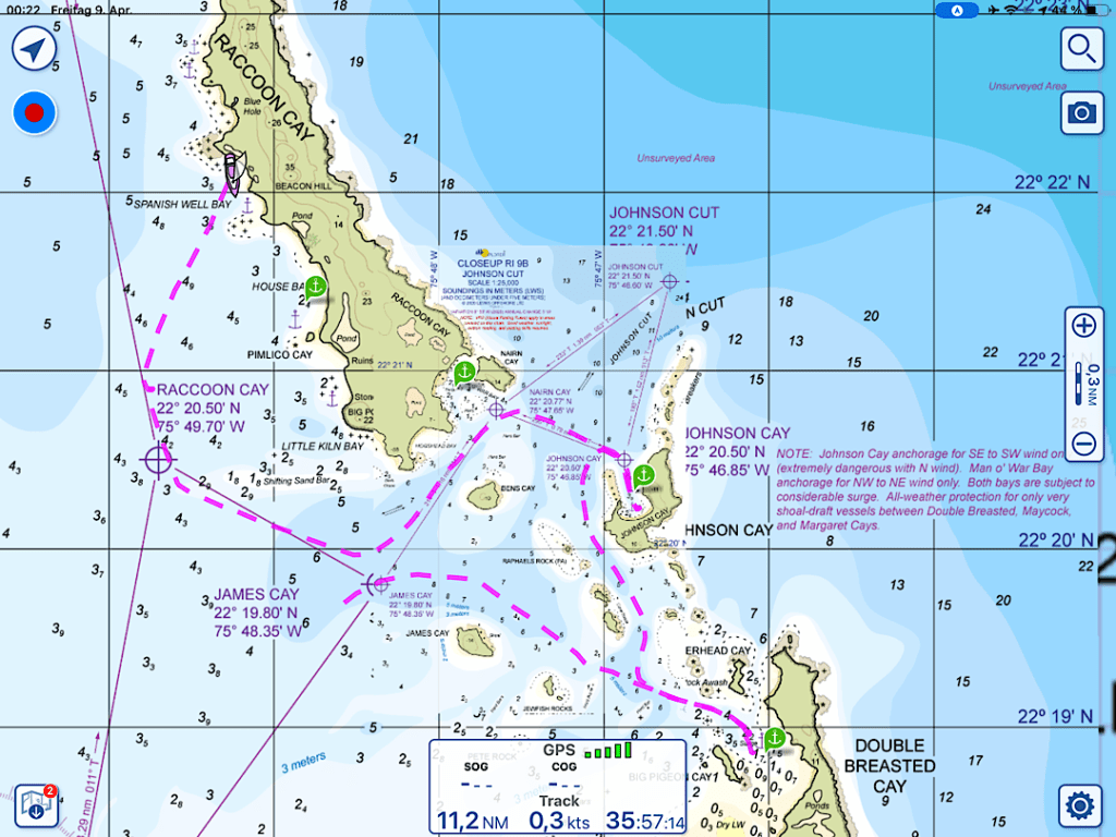 Die Route dorthin ist allerdings durchaus Respekt einflößend. Wie unser Treck in der Navionics-Seekarte zeigt, führt sie über mehrere Flachs, bei denen wir mit unseren 2 Metern Tief schon sorgfältig navigieren müssen.