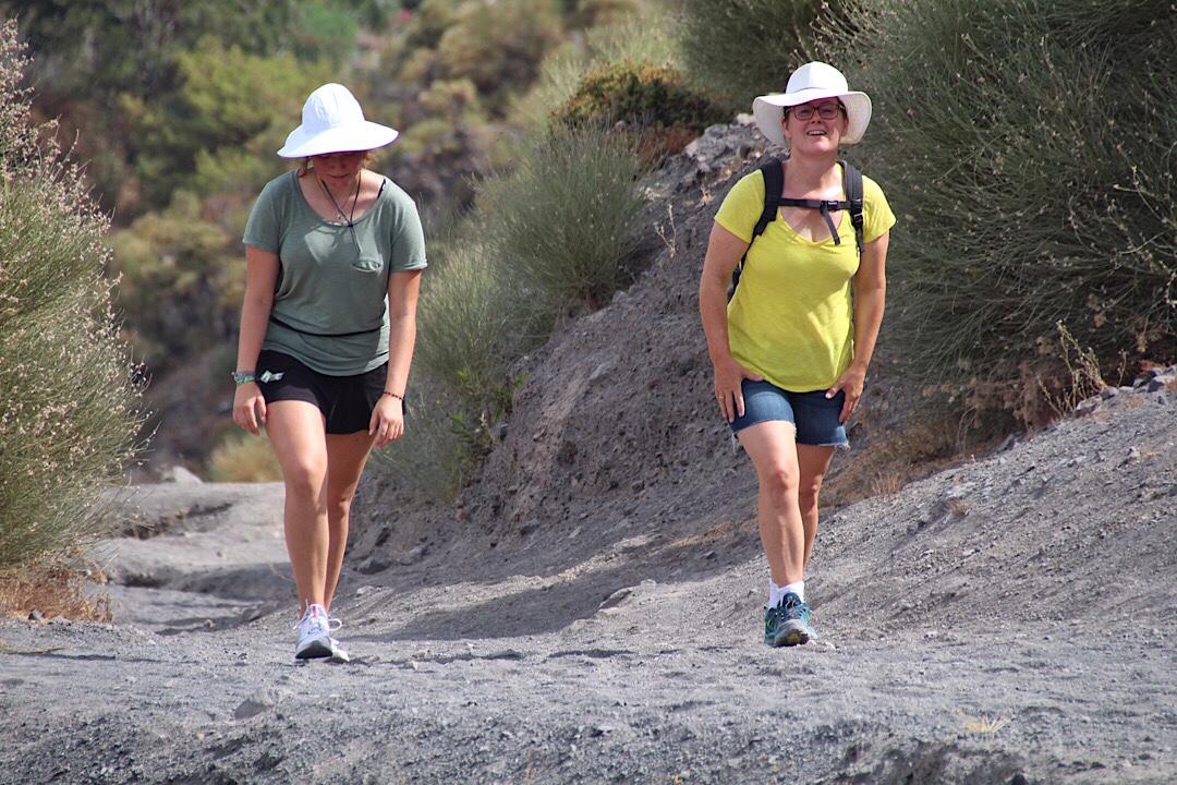 Jetzt mit Wanderschuhen geht’s auf einem zwar unbeschilderten aber meist gut erkennbaren Pfad über loses Geröll hinauf zum Grat des Vulkankraters.