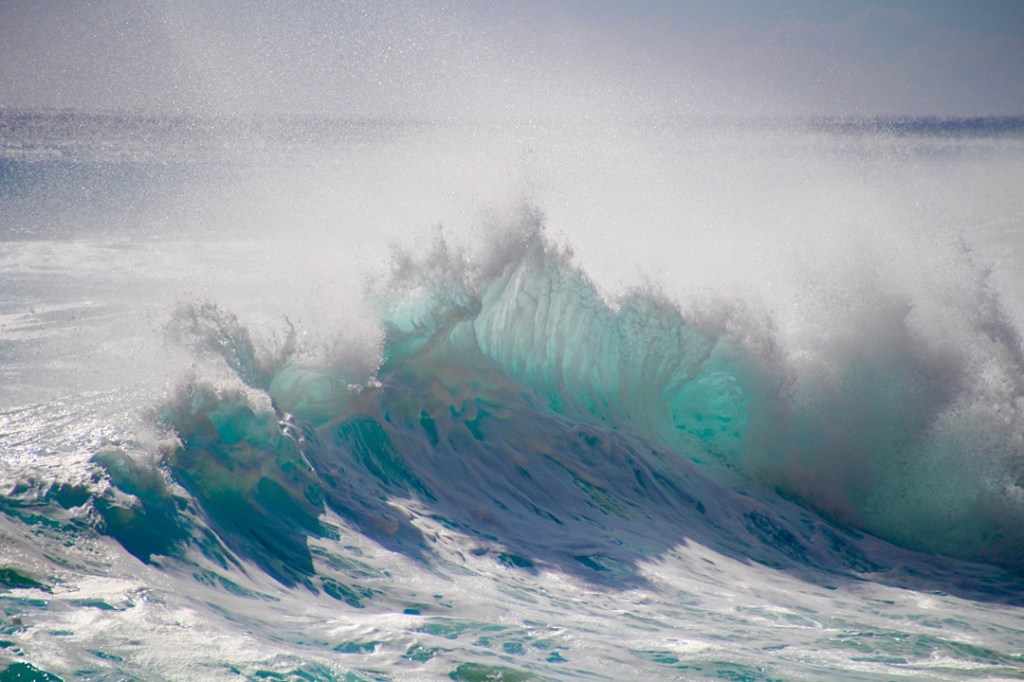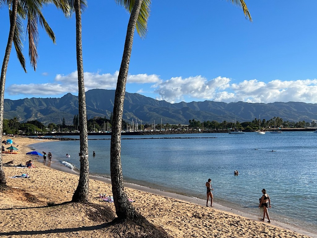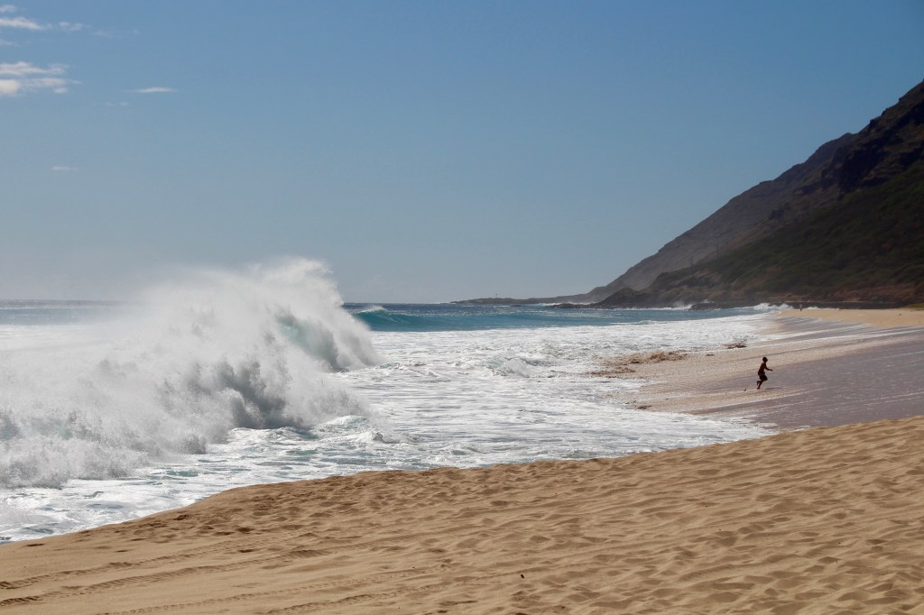 Wie Stein gewordene senkrechte Wellen kurz vorm Brechen muten die Flanken dieser Berge an, oder wie gefaltete “Ziehharmonika”-Berge. Der zumeist vergleichsweise schmale Streifen Flachland zwischen den Steilwänden und dem Meer wird hier im feuchteren Osten der Insel dort wo die Häuser noch Platz lassen meist landwirtschaftlich genutzt. Der breite, weitgehend unzugängliche Gebirgszug Ko’olau nimmt aber fast die Hälfte der Fläche der Insel ein und zieht sich von der Südspitze bis in den Nordosten. An seinen östlich Flanken fahren wir – unterbrochen vom Stop an Giovanni’s Foodtruck – bis zu dem berühmten Surfstrand schlechthin. Der Sunset Beach an O’ahus Nordküste ist legendär. Surfer sehen wir dort aber kaum. Kein Wunder, das Wasser vor dem kilometerlangen Sandstrand ist fast spiegelglatt: