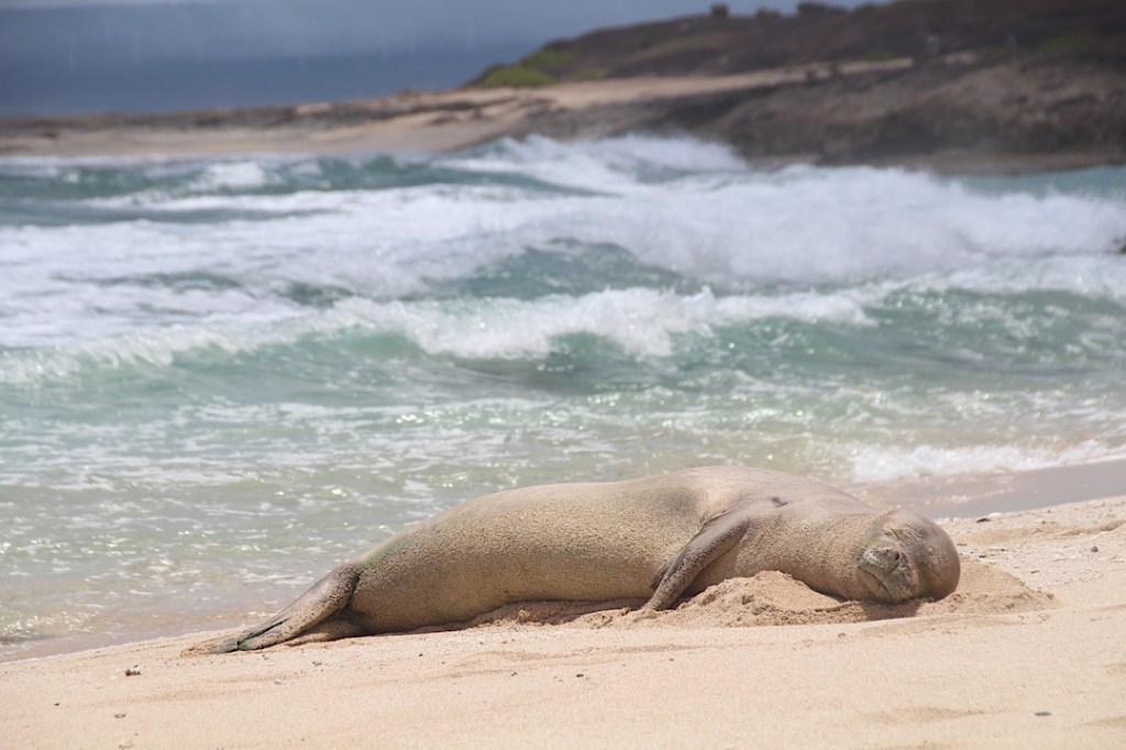 Weiter an der Nordküste entlang findet sich im Nordwesten ein Naturschutzgebiet, dass zwischen sehr felsigen Abschnitten nur kleine, abgelegene und selten besuchte Sandstrände aufweist. Ein Rückzugsgebiet für die selten gewordene Hawaiianische Mönchsrobbe, von der wir eine auf unserem langen Spaziergang dort auch tatsächlich antreffen.