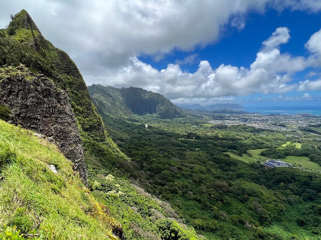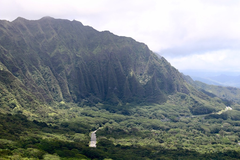 Der Blick geht entlang an den steilen Hänge der Ko’olau Berge.
