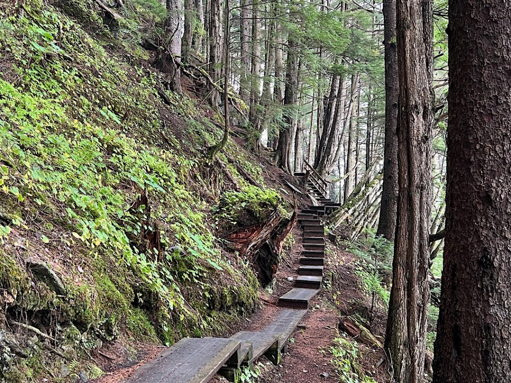 Es ist einfach zu schön hier, wir bleiben noch ein paar Tage in der Ikeda Cove. Wir genießen die Gesellschaft von von Melanie und Chris. Mit ihnen erkunden wir die Bucht, wandern durch die mit Mischwald bestandenen weniger steilen Bereiche um das große Mudflat im Westen des Naturhafens herum. Gemeinsam suchen wir nach den spärlichen Überresten der alten Bergwerkssiedlung. Die Gebäude existieren nicht mehr, aber einige verrostete Metallteile und Ziegelreste können wir aufspüren, zumeist dort, wo lichtere Stellen im Wald den Standort ehemaliger Häuser verraten. Das Rad einer alten Lore findet sich direkt am Ufer, aber die ehemaligen Schienen suchen wir zunächst vergeblich.
