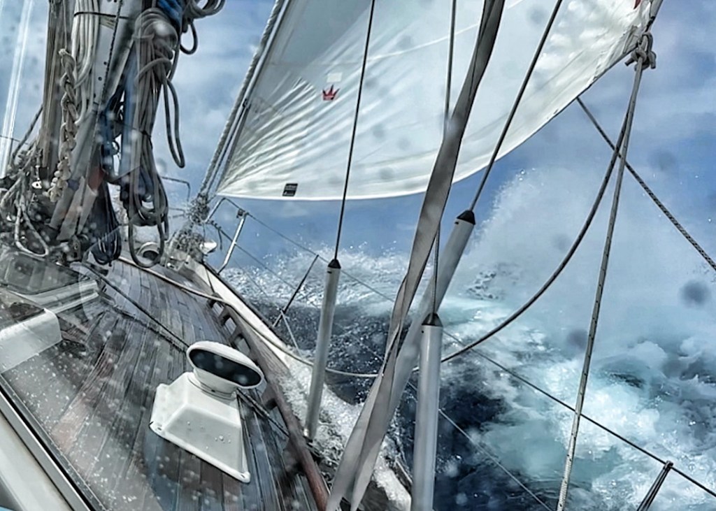 Der Wind dreht endlich von NNE auf Ost und nimmt dabei kräftig zu. Für einige Boote um uns herum etwas zu kräftig, manche berichten von Böen um 45 kn. Über die WhatsApp-Gruppen erfahren wir von mehreren ausgefallenen Autopiloten und vom Wellengang weggerissenen Starlink-Antennen. Eines der Boote erleidet gleich beide Defekte. Wir sind in UKW-Reichweite und geben ihre Position und die Meldung, dass es ihnen gut geht an ein befreundetes Boot weiter. Die informieren dann den Shore-Contact des Bootes.