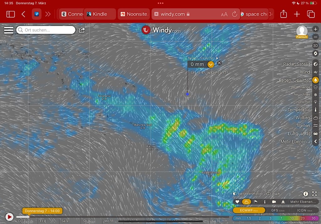 Der Strömung können wir übrigens kaum ausweichen, die Darstellung der Strömungsverhältnisse (auf Windy.com) gleicht eher einer surrealistischen Malerei und die kleinen Kringel verändern sich ständig: