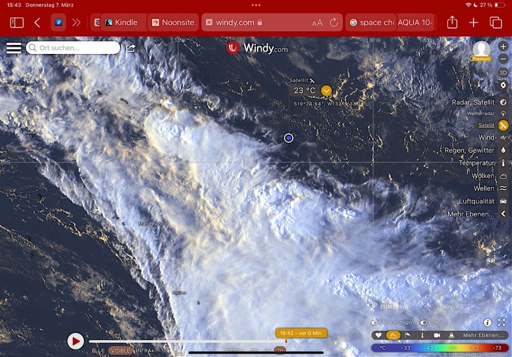 Auf Windy.com schauen wir uns das aktuelle Satellitenbild und die dazugehörige Vorhersage für Regen und Gewitter an.